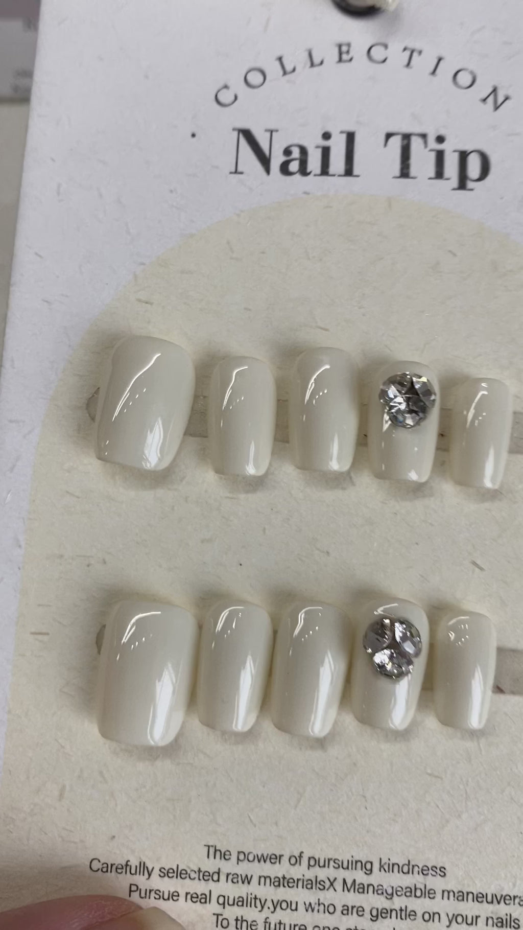 Bílé umělé nehty s elegantními stříbrnými cvočky na dřevěném stojánku. Matný bílý design s lesklými kovovými detaily. Profesionální sada obsahuje 10 kusů v různých velikostech.